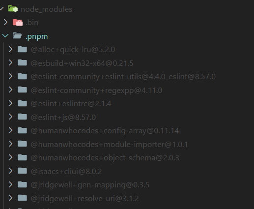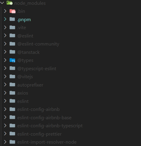 위의 사진처럼 pnpm으로 설치한 패키지는 node_modules아래에 설치된다. 일반적으로 설치된 패키지들은 각각의 의존성을 가진다.