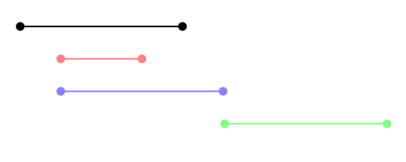 먼저 비교 대상인 선분의 시작점과 끝 점을 start, end 라는 변수에 할당했다. 그 다음 선분들을 하나씩 비교하면서 합선할지, 분리할 지 정해야 하는데 입력받은 점들을 시작점 기준으로 정렬해주면 나올 수 있는 경우의 수가 단 세가지 뿐이다.