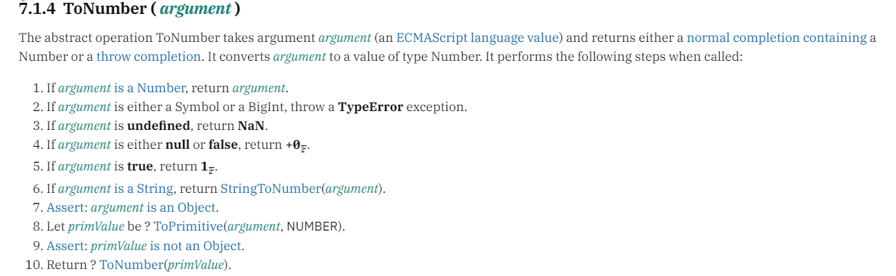 콜백함수 comparator가 정의 되어 있을 때, comparator를 호출하고 그 결과인 v를 반환하도록 되어 있다. 반환값 v는 ToNumber함수를 통해 숫자인지 확인하는 과정을 거치는데 ToNumber 함수 내부의 2번 명세를 보면 BigInt일 경우 TypeError를 던진다고 한다.