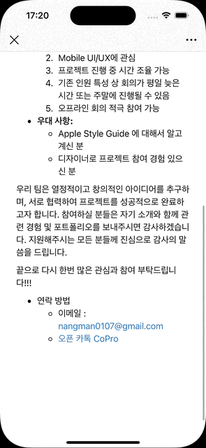 게시글에 이메일 또는 오픈채팅 링크를 추가해서 터치했을 때 이벤트를 만들 고 싶어서 사용해본 예시입니다.