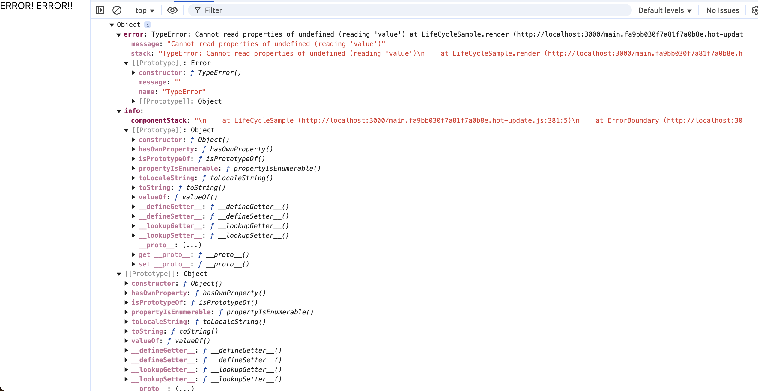 콘솔에는 Error 랑 Object (info)가 찍힌다.