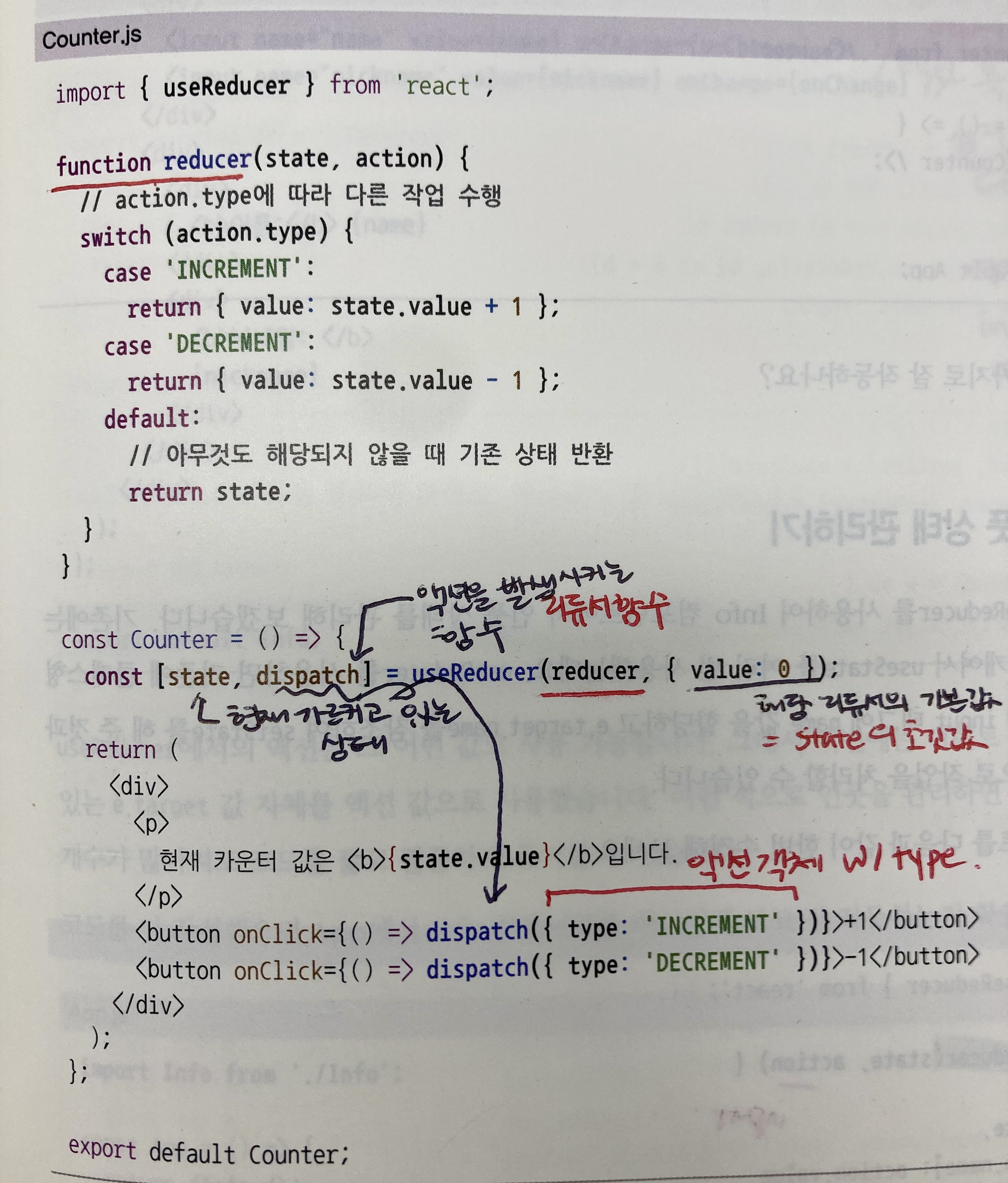 - 현재 상태, 그리고 업데이트를 위해 필요한 정보를 담은 action값을 전달받아 새로운 상태를 반환하는 함수.