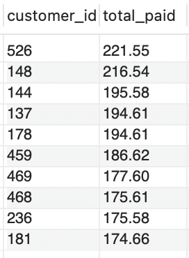 customer 테이블과 payment 테이블을 조인하여 각 고객이 지불한 총 금액을 계산하고, 지불 금액이 가장 많은 10명의 고객을 조회