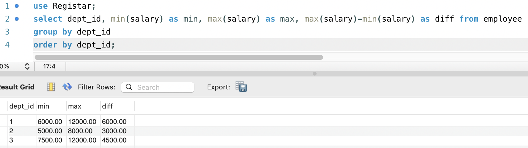 select dept_id, min(salary) as min, max(salary) as max, max(salary)-min(salary) as diff from employee