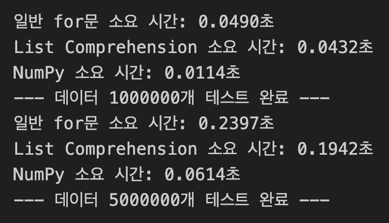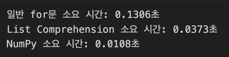 print(f"List Comprehension 소요 시간: {time.time() - start:.4f}초")