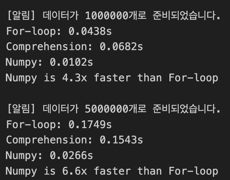 print(f"Numpy is {speedup:.1f}x faster than For-loop")