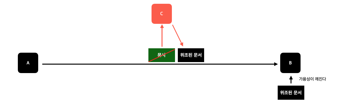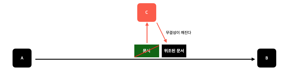 만약 C가 중간에 가로챈 데이터를 삭제하고 다른 데이터를 B에게 보낸다면