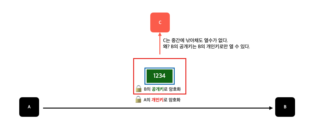 a가 데이터를 보낼 때 b의 공개키로 암호화해서 보낸다. 이는 b의 개인 키로만 복호화가 가능하기 때문에 만약 탈취 당하더라도 c는 읽을 수 없다.