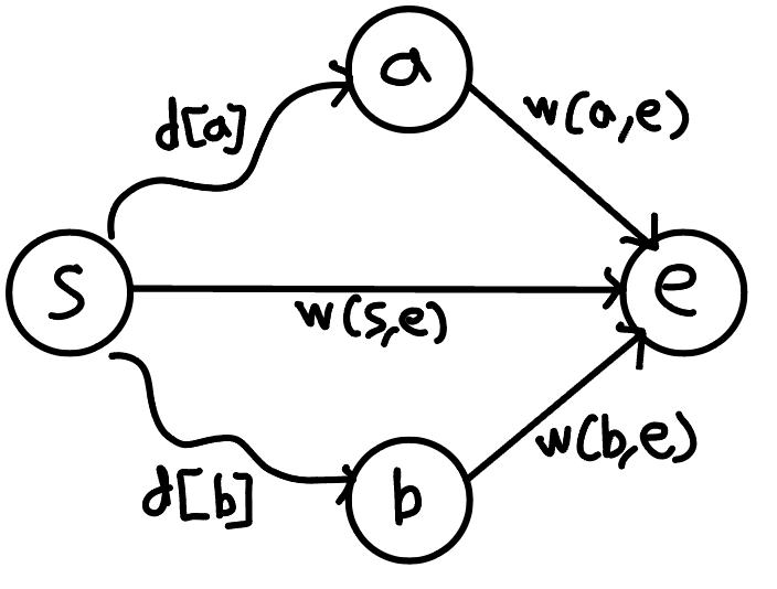정점 v까지의 최단 거리를 d[v] 라고 한다.시작 정점 s 가 있고, d[a], d[b] 값은 구해져 있는 상태이다.s -> e, a -> e, b -> e 가 존재한다.i -> j 간선의 가중치는 w(i, j) 로 표현)위 그래프에서 시작 정점 s부터 정점 e까지의 최소 비용 d[e] 를 구하기 위한 방법은 다음과 같다.
