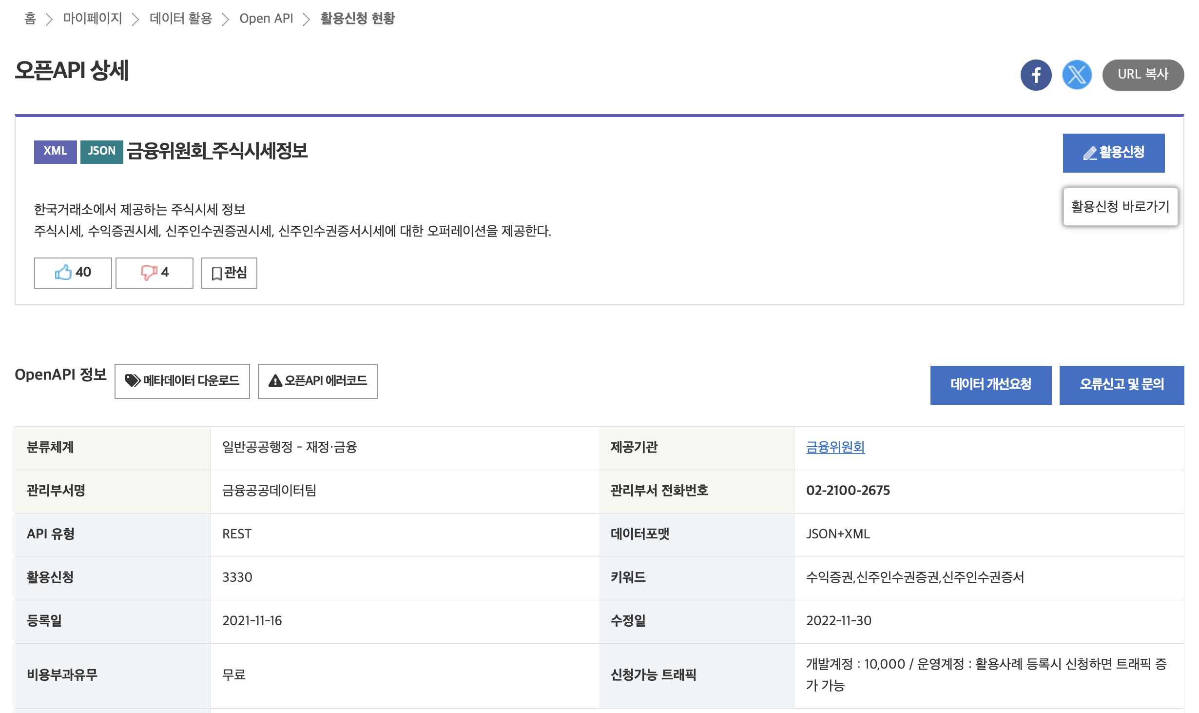 그리고 사용하고 싶은 데이터를 검색하여 선정, 상세정보 페이지로 들어갑니다