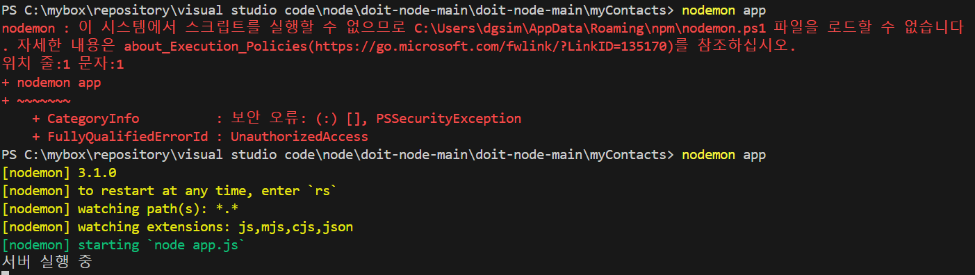 PS C:\mybox\repository\visual studio code\node\doit-node-main\doit-node-main\myContacts> nodemon app