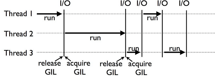 위의 이미지에서는 3개의 스레드가 어떠한 방식으로 GIL을 사용하는지 설명하고 있다. 각 스레드는 GIL이라는 일종의 Lock을 획득해야만 자원을 할당받고, 사용할 수 있다. 그동안 다른 스레드는 GIL이 풀릴 때까지 자원에 접근할 수 없다. 즉, 파이썬에서는 멀티스레딩을 유도하더라도, 실제로 여러 스레드가 동시에 작업하지 못하게 되는 것이다.