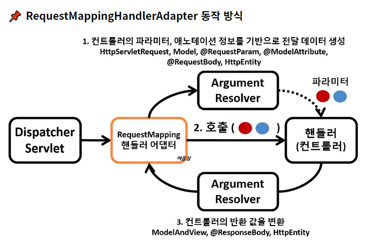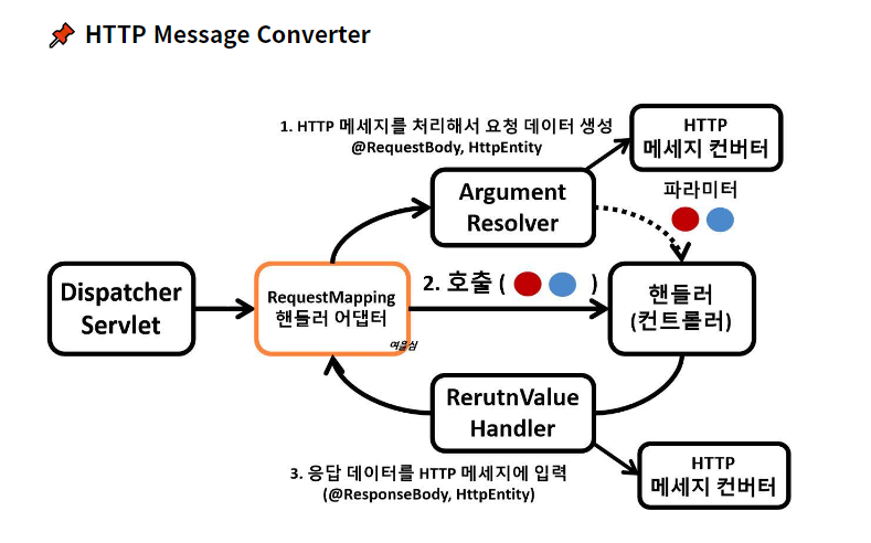 HandlerAdaptor -> ArgumentResolver -> (Message converter)-> Handler -> ReturnValueHandler ->HandlerAdaptor 라는 일련의 과정이 숨겨져 있다.
