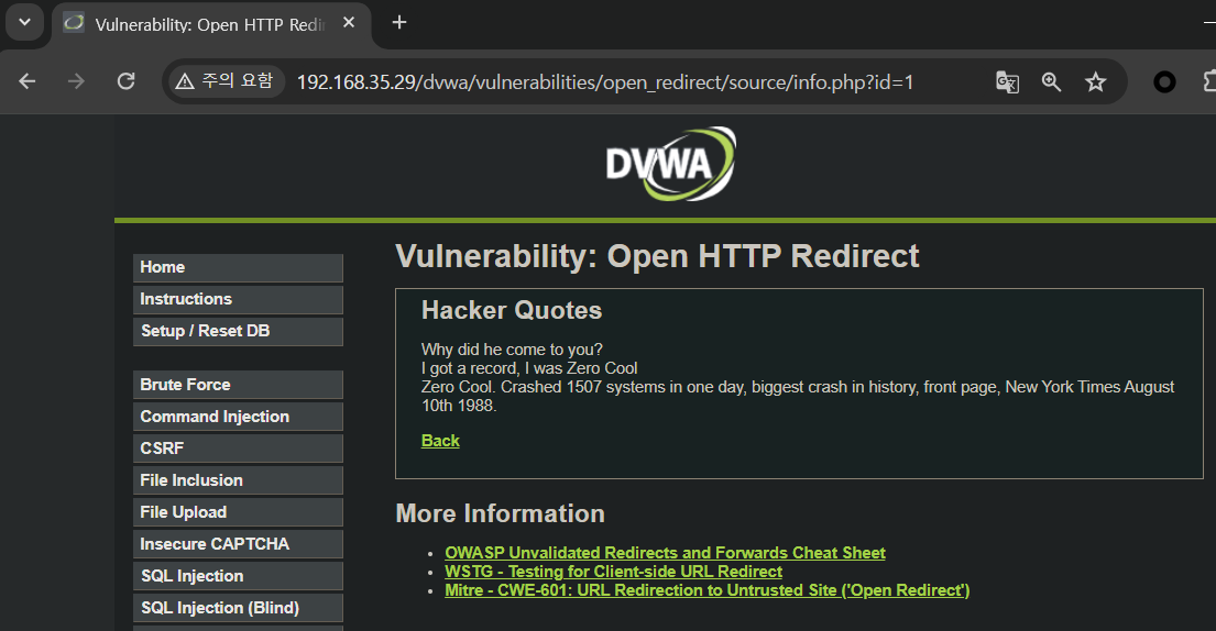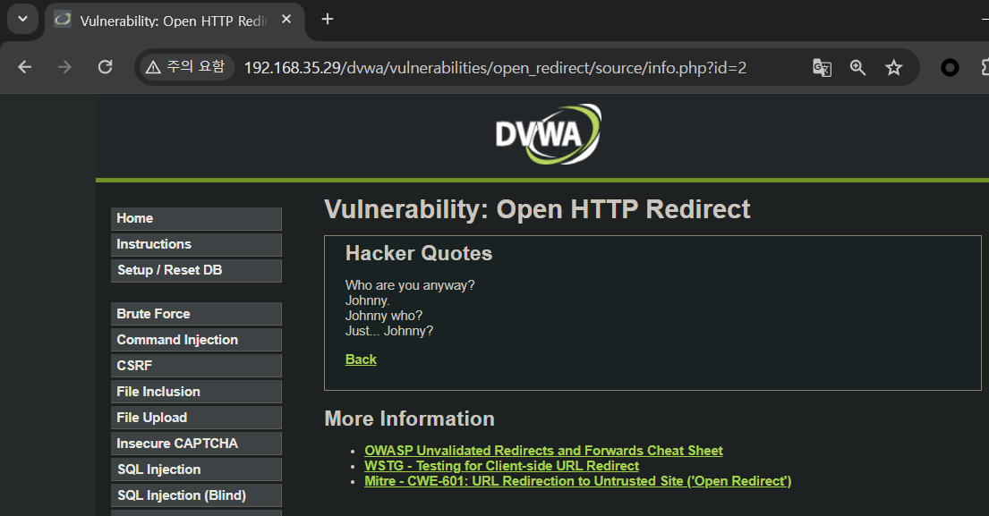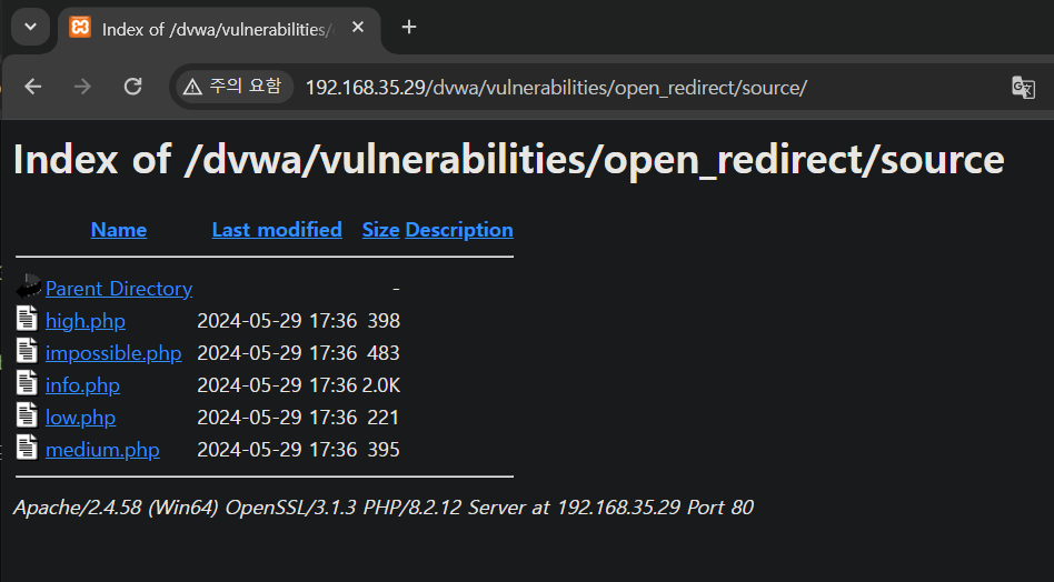 - Quote 페이지 위치( dvwa/vulnerabilities/open_redirect/source/ ) 접속 시 디렉토리가 노출된다.