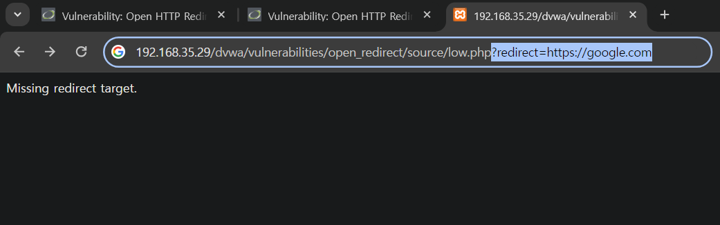 - URL 에 리다이렉트 파라미터( ?redirect=https://google.com )를 추가한다.