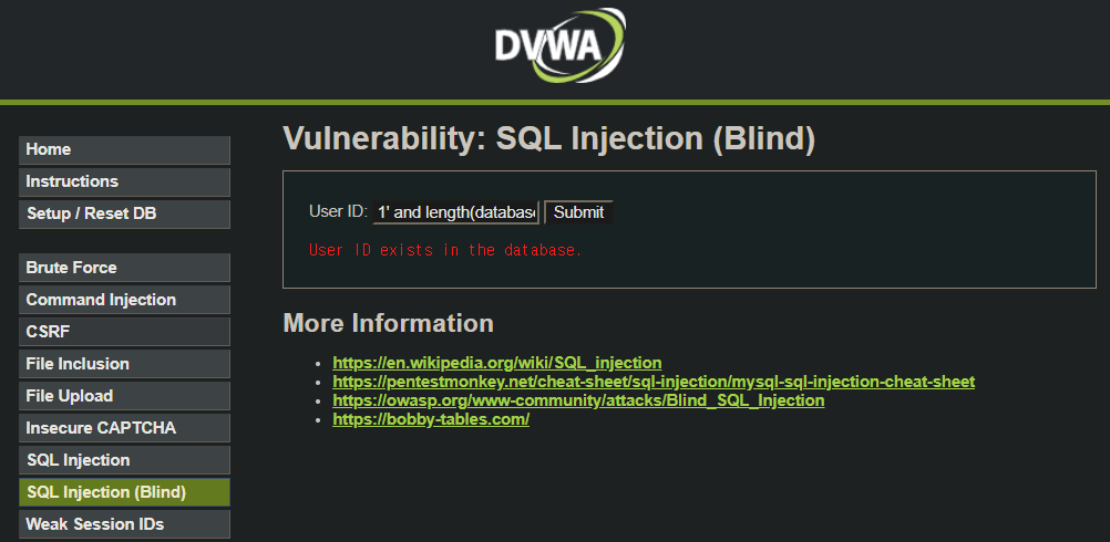 - ' OR length(database()) = 4-- 와 같은 입력으로도 가능하다.