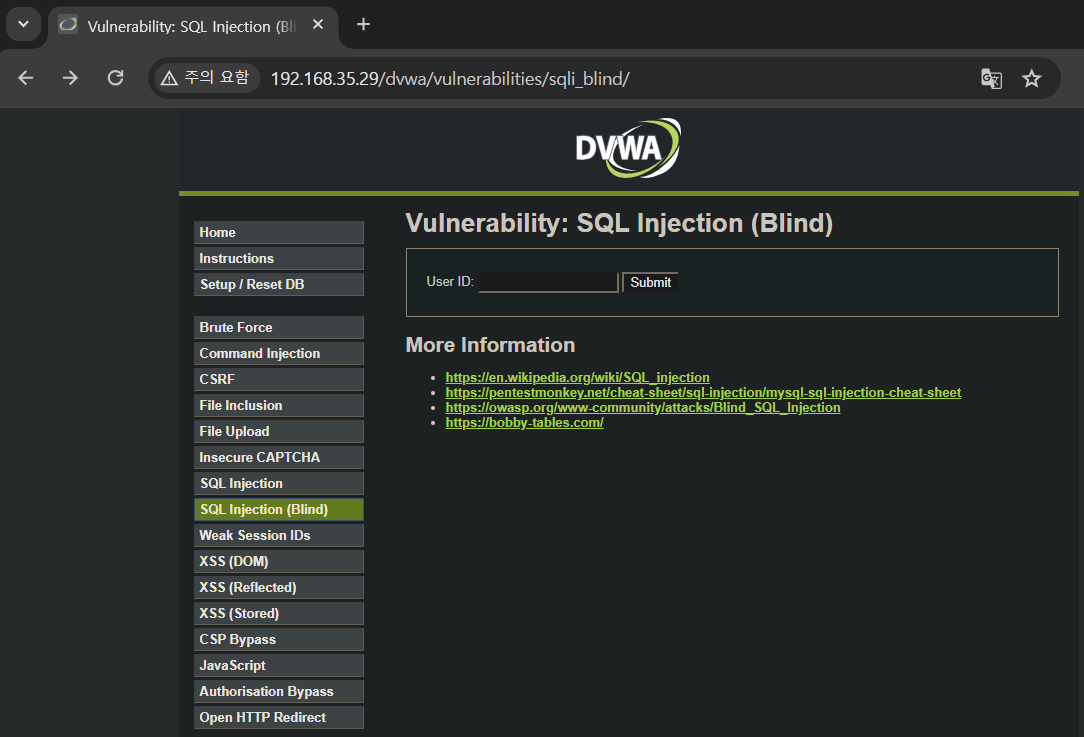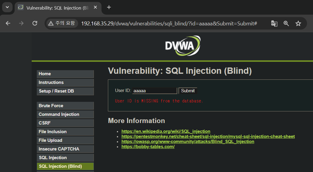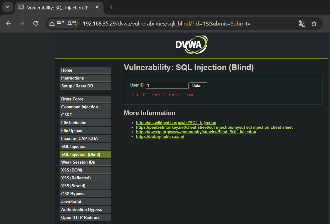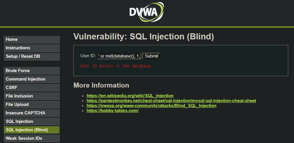 - 데이터 입력 시 출력문 자체가 없거나 출력문의 차이가 없는 경우, 1 이라는 데이터가 있다는걸 확인 후 1' AND mid(database(), 1,1) = 'd' AND sleep(3)-- 와 같은 입력으로 데이터베이스의 이름의 첫 글자가 d 이면 3초 대기 후 반응이 올 것이고, d 가 아니면 원래 속도대로 즉시 반응이 올 것이다.