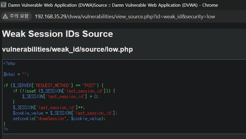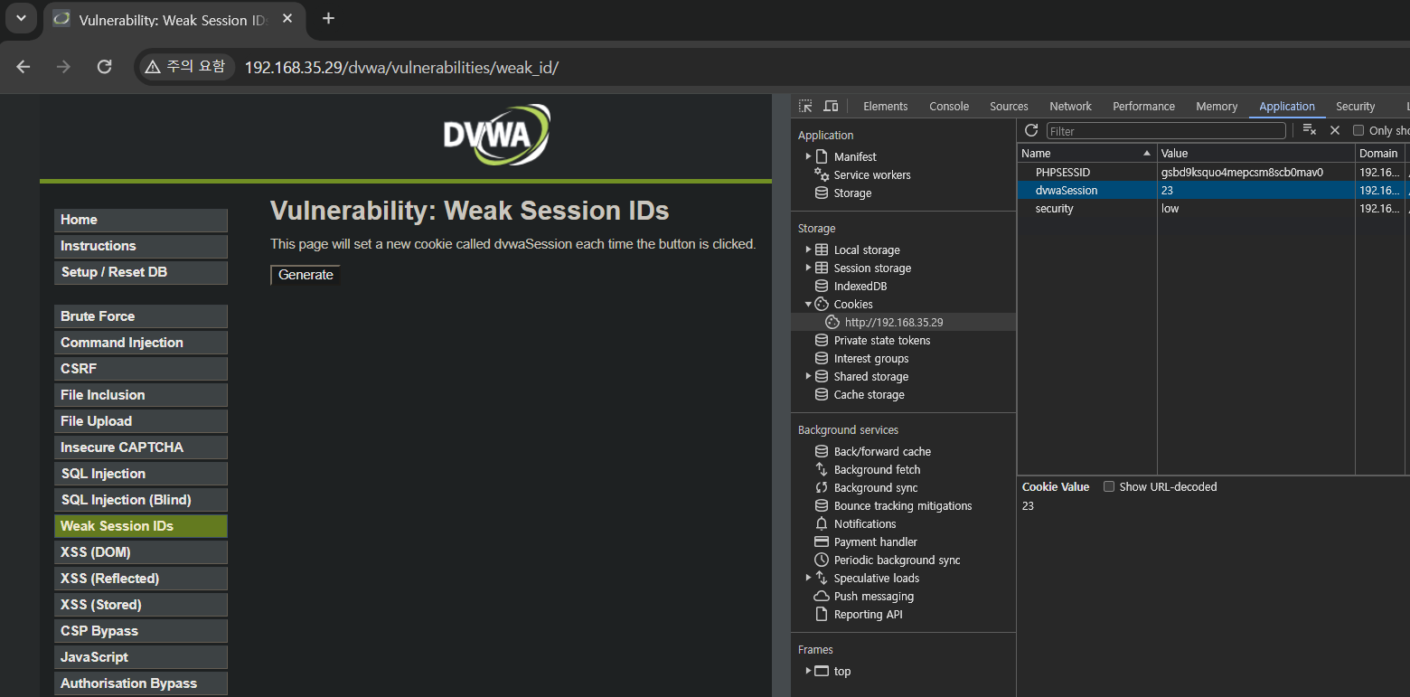 세션 ID가 예측 가능하게 노출되어 있을 경우, 개발자도구나 웹 프록시 등으로 값이 조작되어 다른 세션이 탈취될 수 있다.