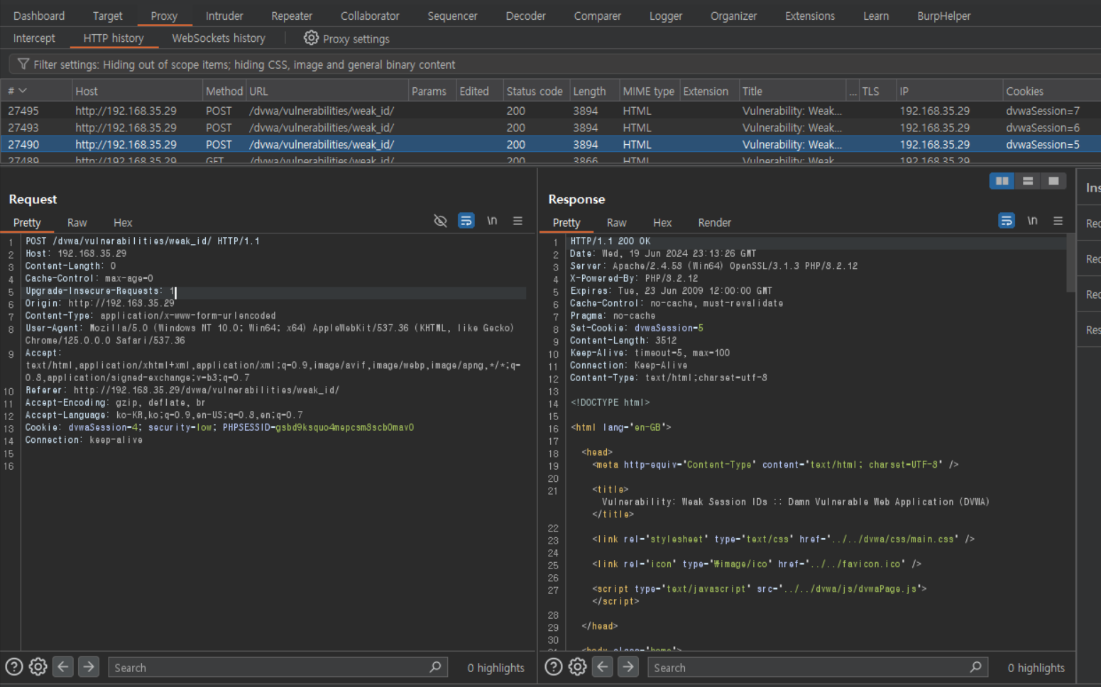 웹으로 POST를 보내면 Set-Cookie: dvwaSession 값이 1씩 증가하는 패턴으로 나타난다.