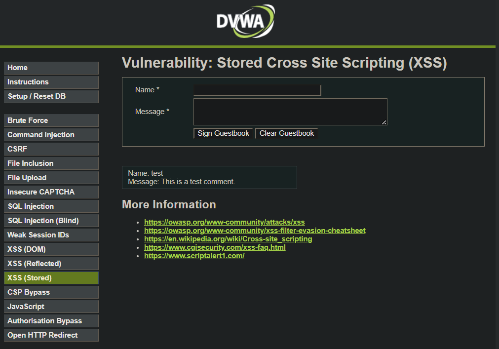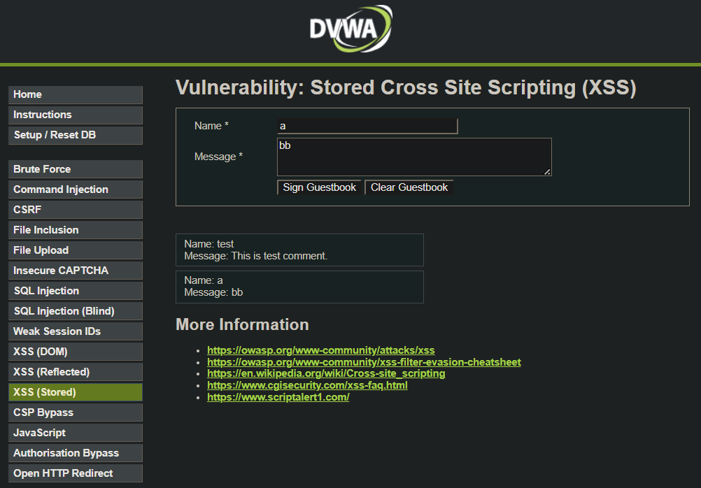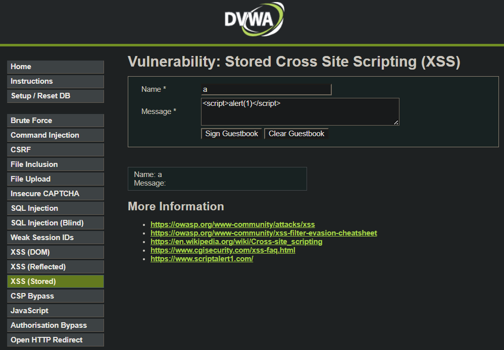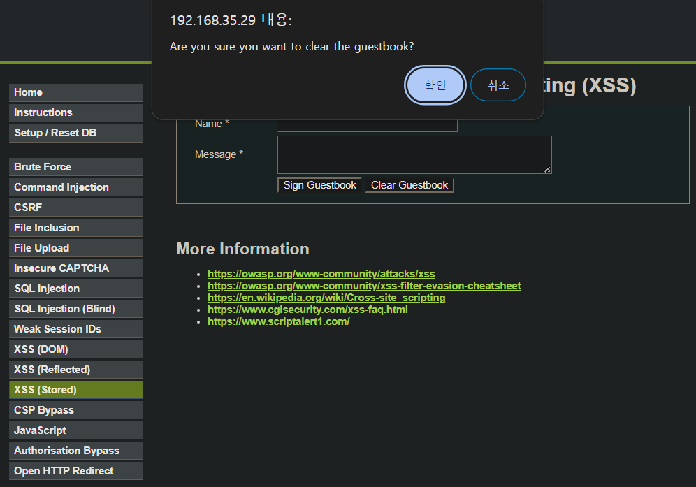 Message 에 <script>alert(1) 를 입력했더니 스크립트가 실행되었으며, 해당 웹 페이지에 접속 할 때 마다 스크립트가 실행된다.