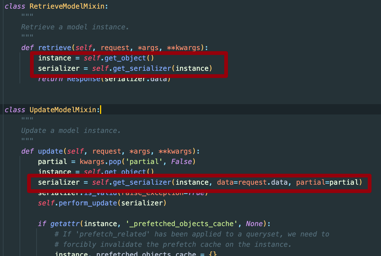 메소드 핸들러는 get_queryset 및 get_object메서드를 호출하여 요청된 모델 객체를 검색한다.
