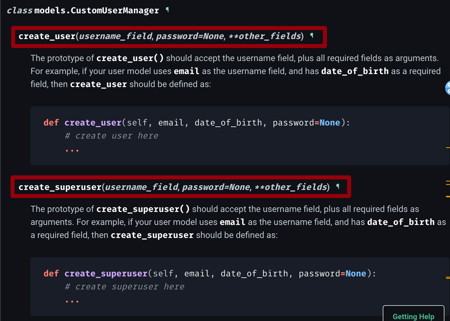 Django Docs에서의 예시는 사용자이름 필드 -> Email Setting, 생년월일 필드가 Required이기 때문에 email, date_of_birth를 매개변수로 받는 것을 확인할 수 있습니다.