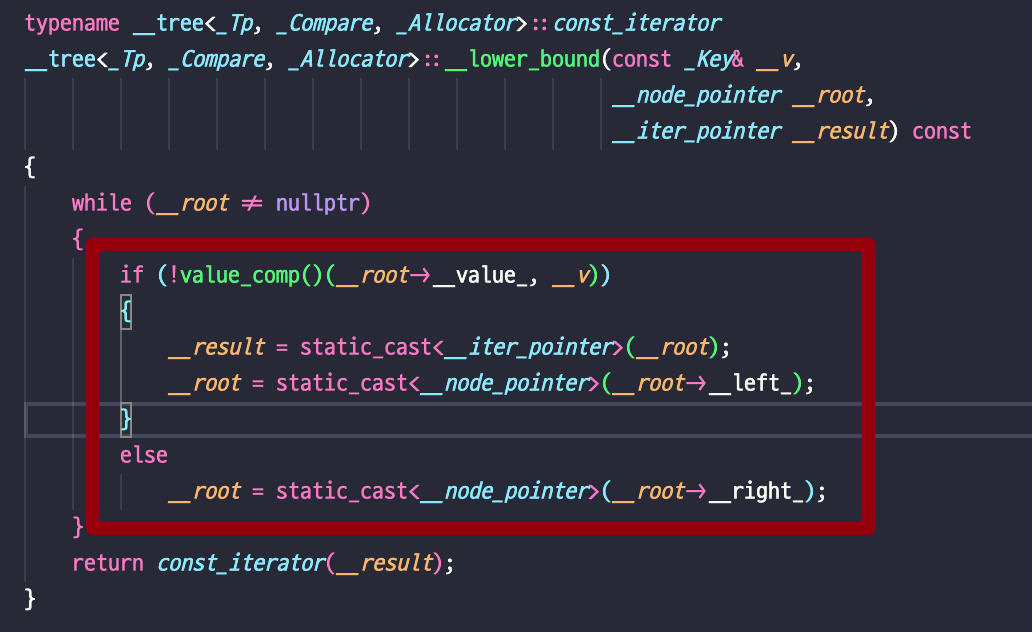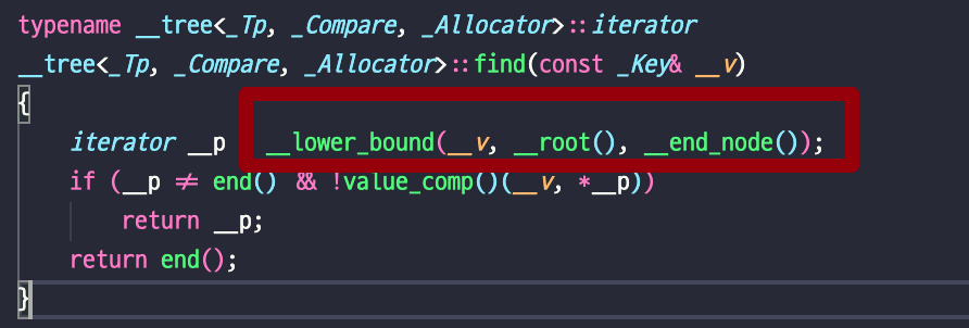 tree.find 메서드를 들어가보면 __lower_bound 함수를 호출하는 것을 볼 수 있다.