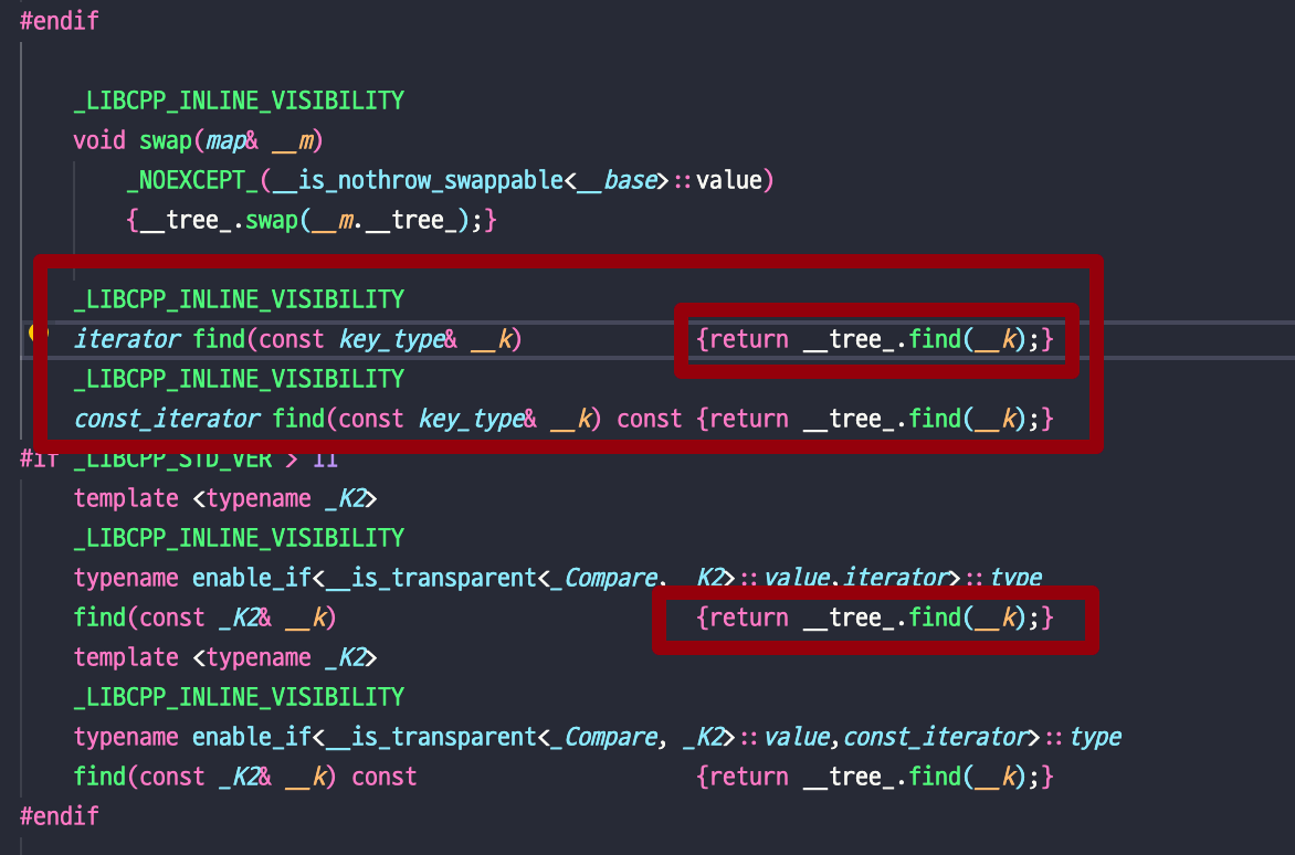 Key와 value 사이에는 4바이트 차이가 난다.<int, int>이기 때문이다.find 메서드를 들어가보면 tree 자료구조의 find 메서드를 사용하는 것을 볼 수 있다.