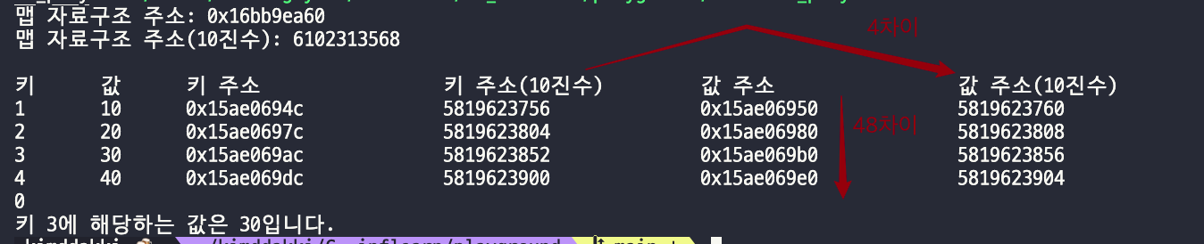 cout << "키\t값\t키 주소\t\t\t키 주소(10진수)\t\t값 주소\t\t\t값 주소(10진수)" << "\n";