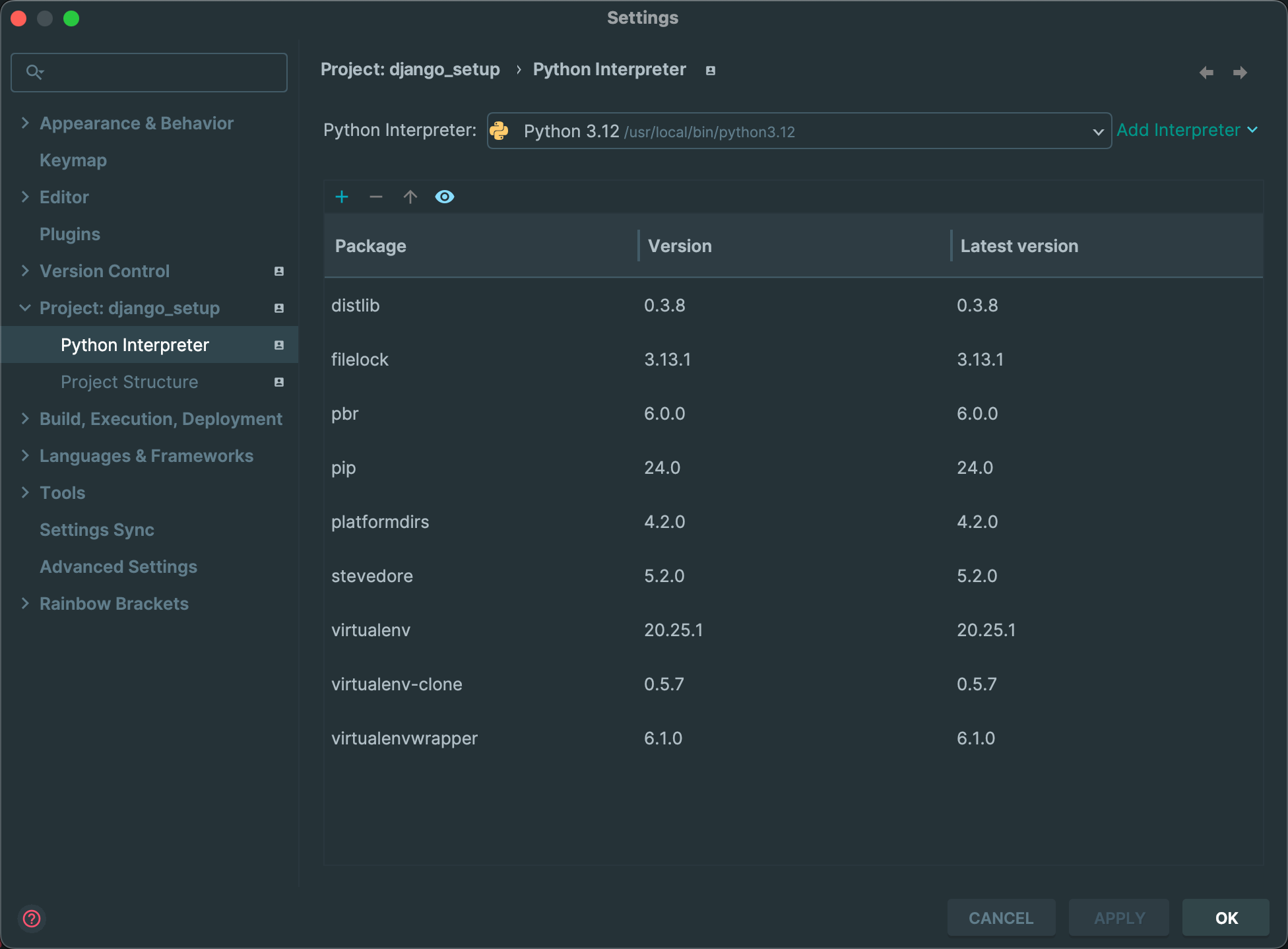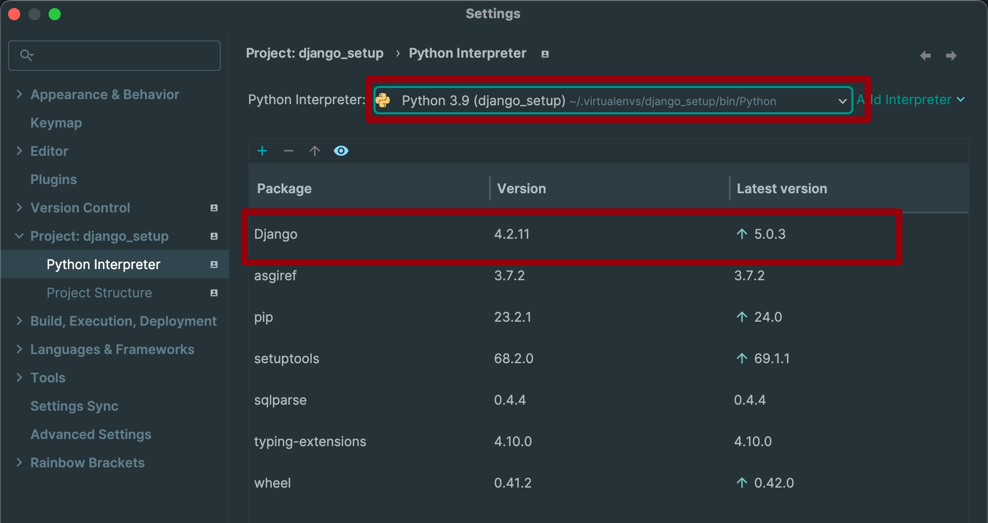 ✅ local에 다운로드 되어 있는 Python 인터프리터에는 가상 환경 세팅을 위한 라이브러리만 다운 받아져 있고 Django 라이브러리를 다운받아져 있지 않기 때문이다!