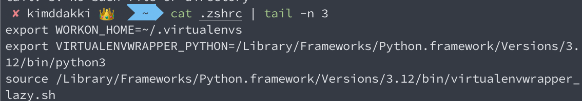 아래 환경 변수 설정 및 virtualenvwrapper_lazy.sh 스크립트 실행