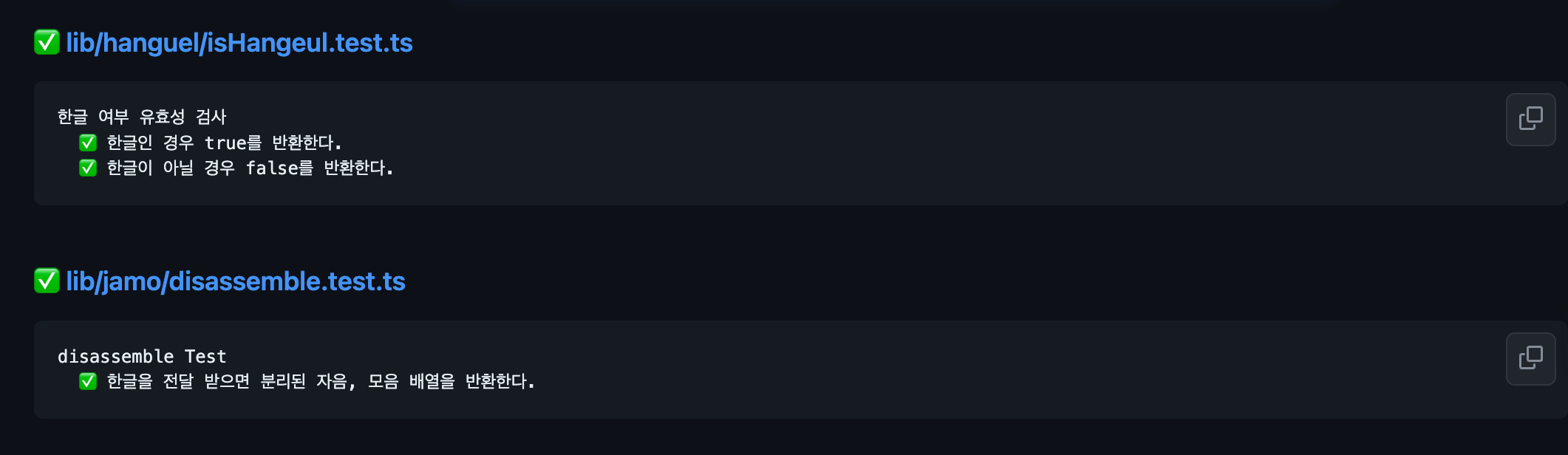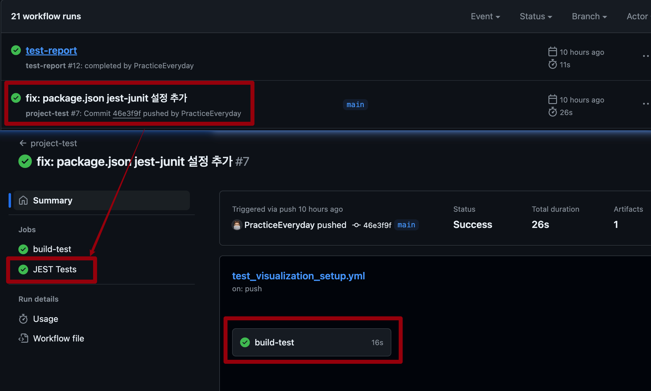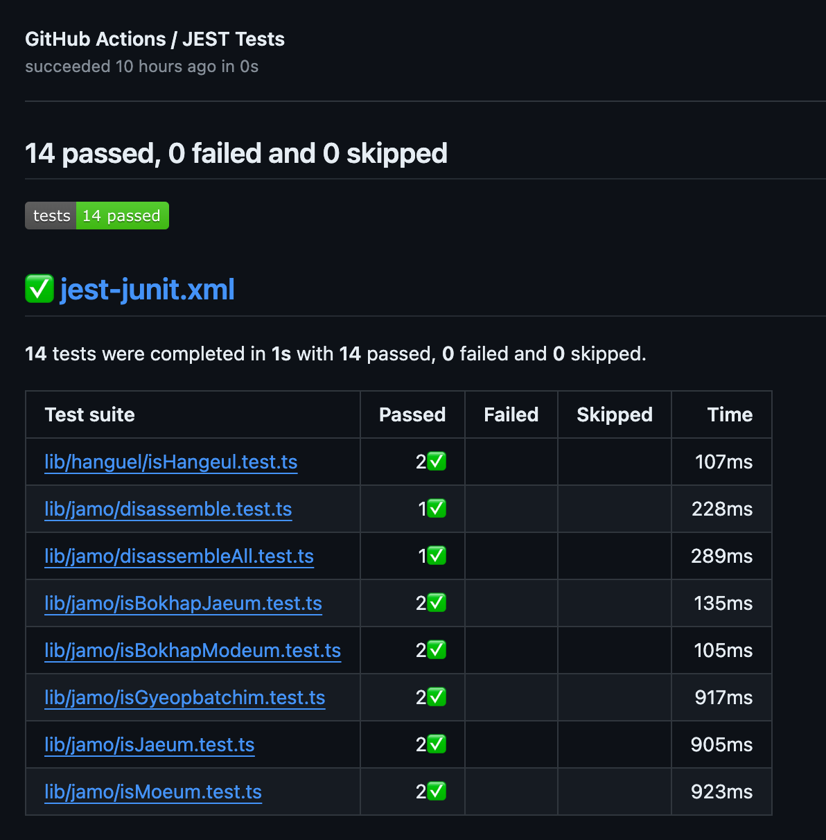 Actions가 정상적으로 진행되고 난 뒤 build-test 하위에 JEST Tests 탭이 생기는 데 클릭하여 들어가보면 아래와 같이 테스트가 시각화 되어 있는 것을 확인 할 수 있다. 🎉🎉