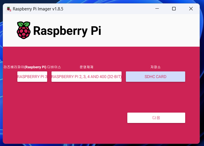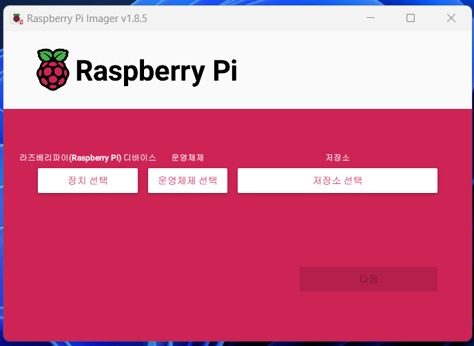 Raspberry Pi Imager를 열면 위와 같은 화면으로 구성되어 있습니다.