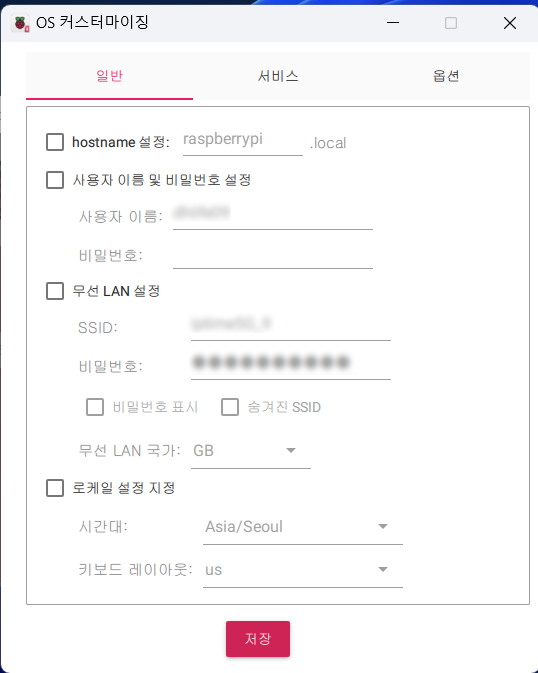 OS 커스터마이징 설정화면에 진입하면 일반/서비스/옵션 탭이 있습니다.