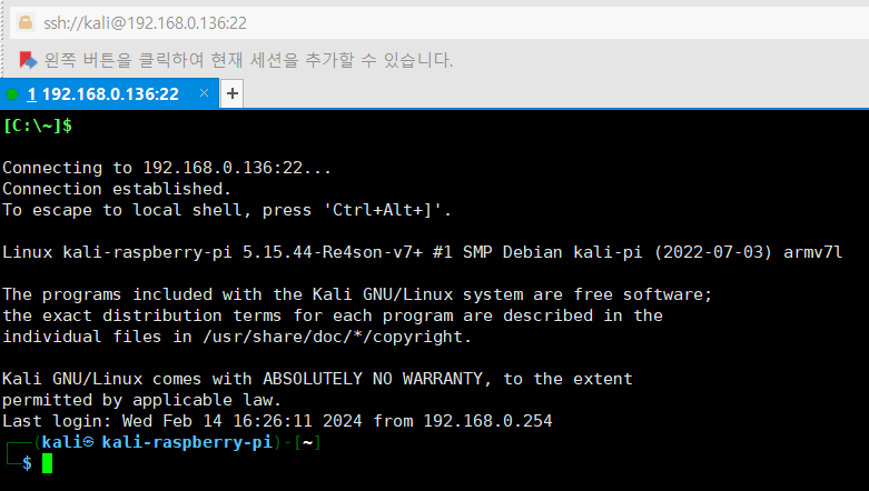 그리고 최종적으로 현재 개인서버용으로 구동 중인 라즈베리파이 외에도 놀고 있는 라즈베리파이가 있어서, 그냥 간단하게 사용하고자 라즈베리파이에 칼리 리눅스를 설치해주었습니다.