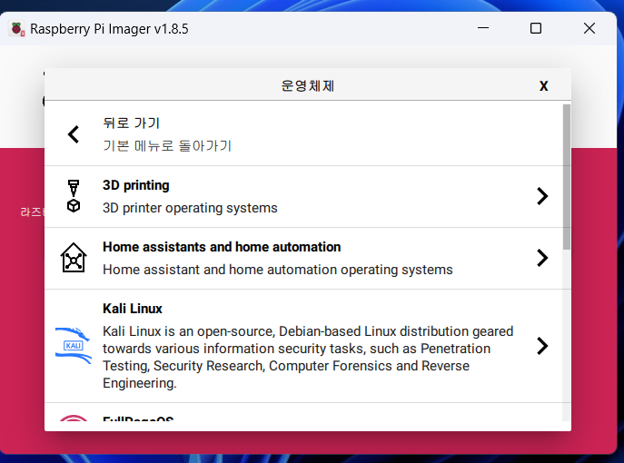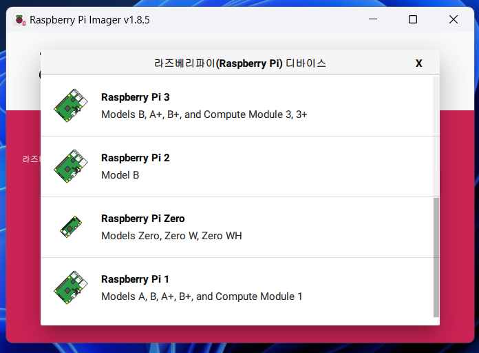 라즈베리파이5/4/3 등 설치할 라즈베리파이를 누르면 됩니다.
