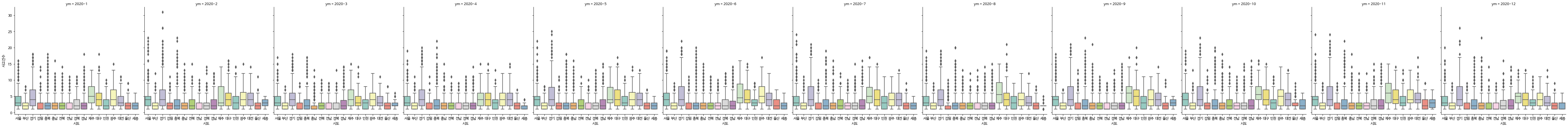 sns.factorplot(x='시도', y='사고건수', col='ym', kind='box', palette='Set3', data=df)