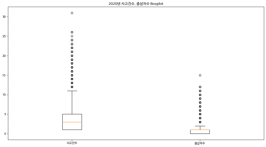 plt.title('2020년 사고건수, 중상자수 Boxplot')
