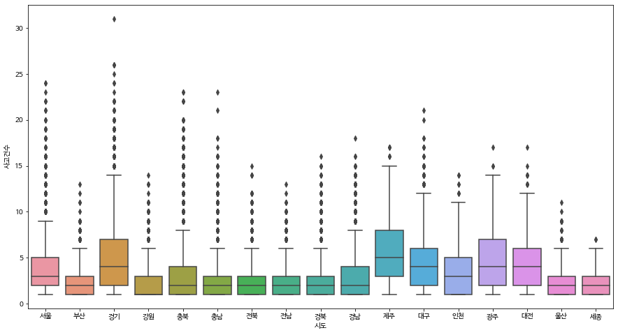 sns.boxplot(x='시도', y='사고건수', data=df)
