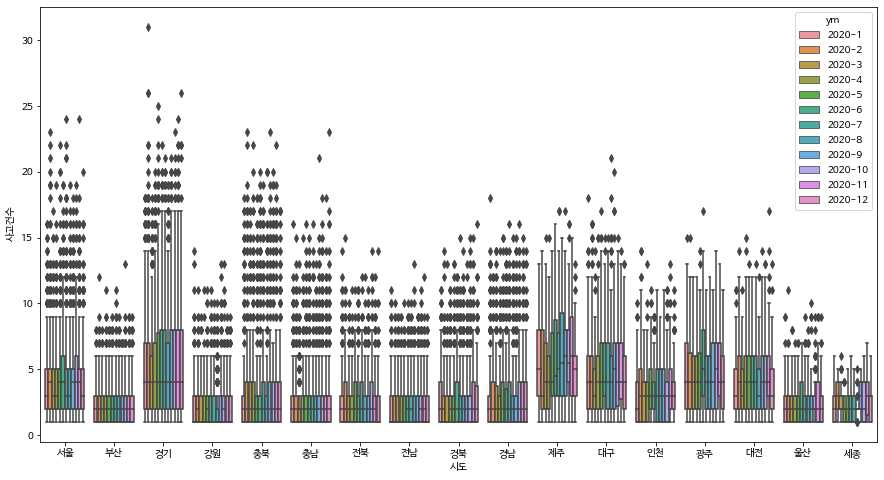 sns.boxplot(x='시도', y='사고건수', hue='ym', data=df)