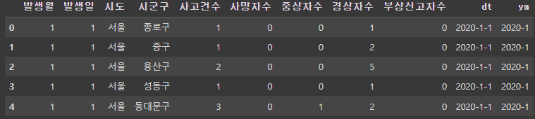 df = pd.read_excel("/content/drive/MyDrive/패스트캠퍼스/도로교통공단_일자별 시군구별 교통사고 건수.xlsx")