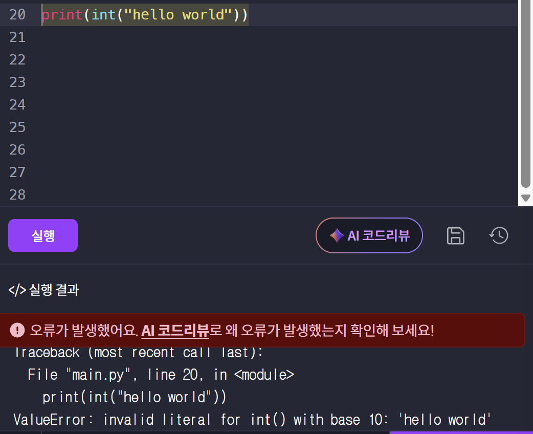 print(int("hello world")) -> 변환 불가로 오류 발생