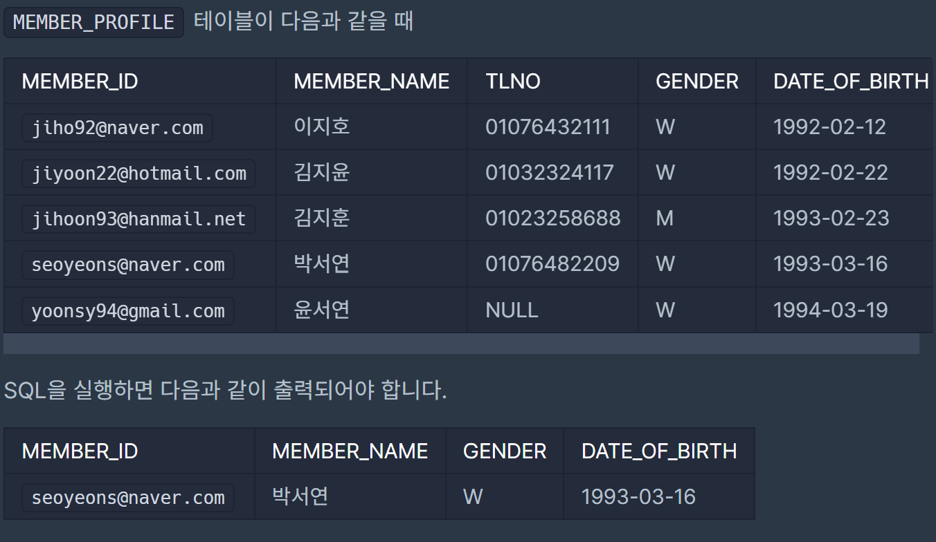 다음은 식당 리뷰 사이트의 회원 정보를 담은 MEMBER_PROFILE 테이블입니다. MEMBER_PROFILE 테이블은 다음과 같으며 MEMBER_ID, MEMBER_NAME, TLNO, GENDER, DATE_OF_BIRTH는 회원 ID, 회원 이름, 회원 연락처, 성별, 생년월일을 의미합니다.
