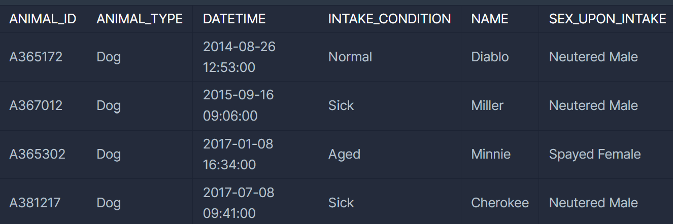 이 중 아픈 동물은 Miller와 Cherokee입니다. 따라서 SQL문을 실행하면 다음과 같이 나와야 합니다.