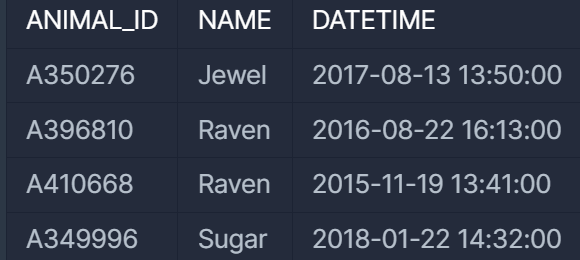 SELECT ANIMAL_ID, NAME, DATETIME