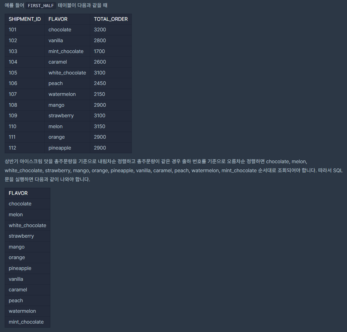 FIRST_HALF 테이블은 아이스크림 가게의 상반기 주문 정보를 담은 테이블입니다.FIRST_HALF 테이블 구조는 다음과 같으며, SHIPMENT_ID, FLAVOR, TOTAL_ORDER는 각각 아이스크림 공장에서 아이스크림 가게까지의 출하 번호, 아이스크림 맛, 상반기 아이스크림 총주문량을 나타냅니다.