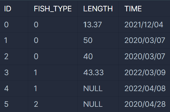 예를 들어 FISH_INFO 테이블이 다음과 같다면