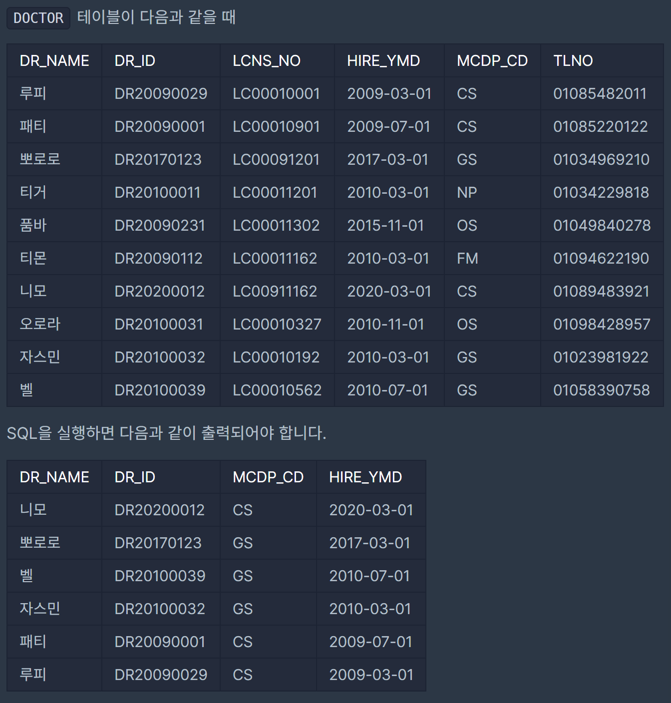 ORDER BY HIRE_YMD DESC, DR_NAME ASC;