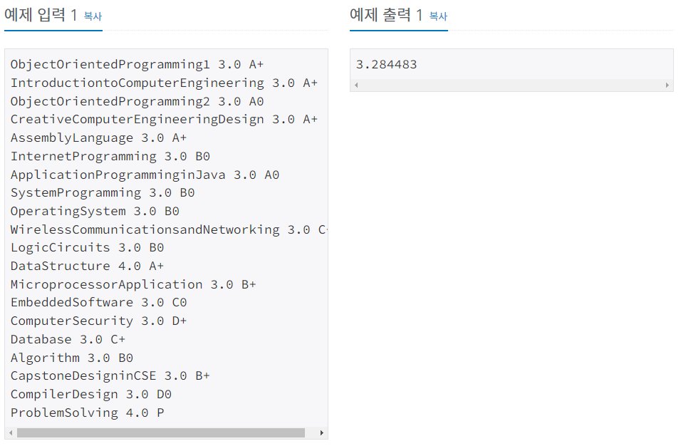 과목명과 float 타입의 학점(credit), 등급이 한줄에 띄어쓰기 포함하여 주어지고 총 20개의 과목이 주어진다.