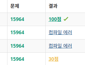 처음 제출이 부분점수가 떴다. 30점은 기본 점수 인거같은데 뭐지.